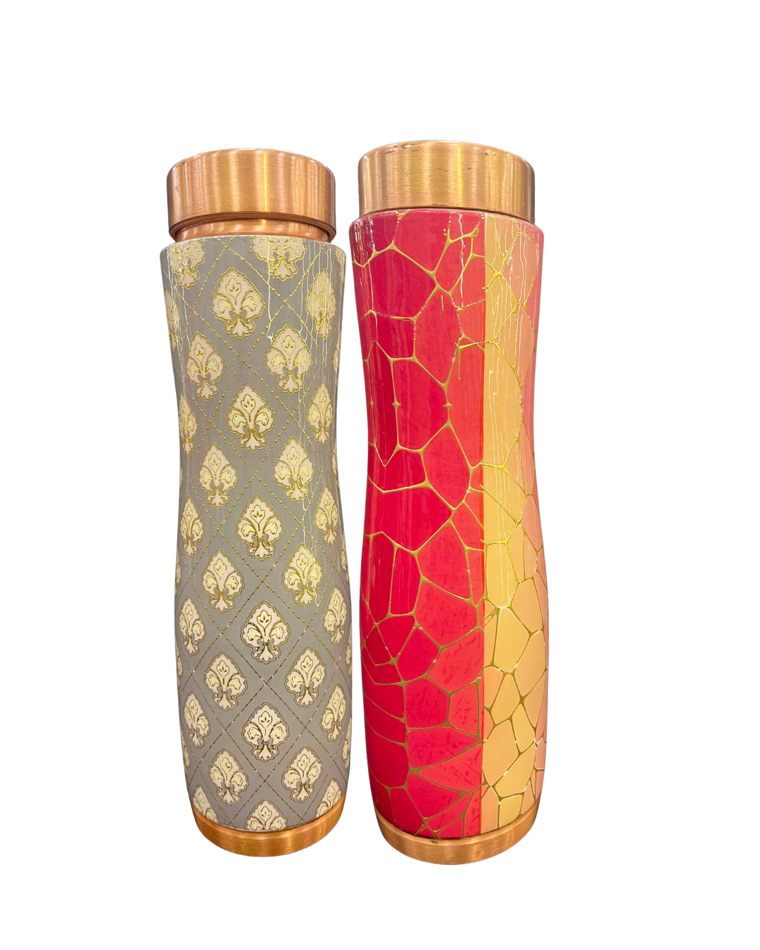 Elevate your hydration experience with this beautifully crafted Printed Designer Copper Water Bottle set. Each bottle is made from 100% pure copper, promoting Ayurvedic health benefits. With traditional and abstract artistic prints, these bottles not only serve as water containers but also as aesthetic home decor.